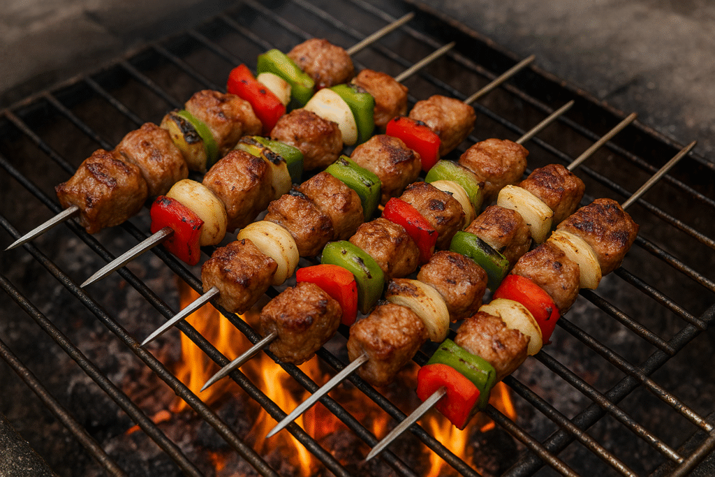 - 蔬菜不可少:烤肉串搭配香菇、青椒、杏鮑菇、筊白筍,清爽又解膩。